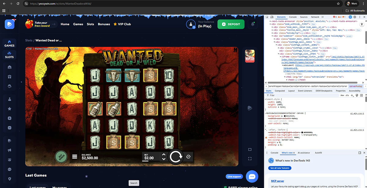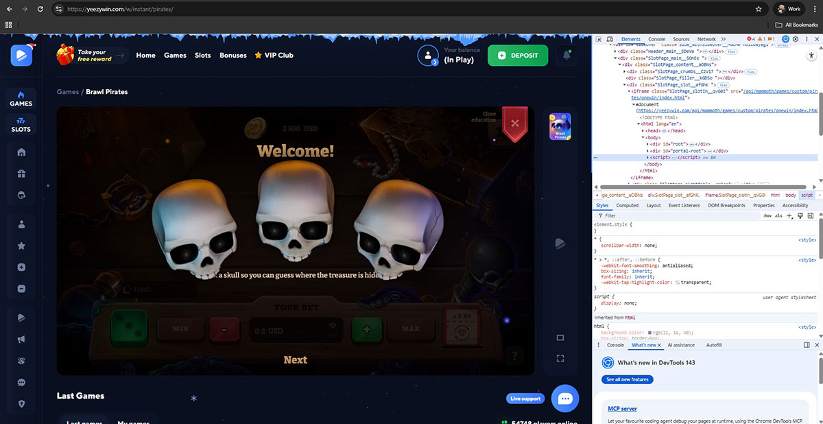 In addition to irregular licensing and ownership issues, Yeezywin Casino displays game content attributed to major providers including Pragmatic Play, Hacksaw Gaming, BGaming, Evoplay, and 1Win. Technical inspection confirmed that these games are non-authentic and do not originate from official provider servers. Indicators included manipulated JavaScript, mismatched source paths, and the absence of legitimate remote game infrastructure. This configuration enables full casino-side control over displayed balances, game logic, payout behavior, and withdrawal outcomes.